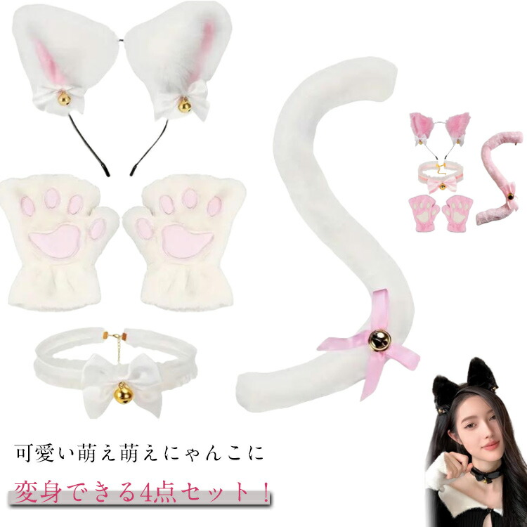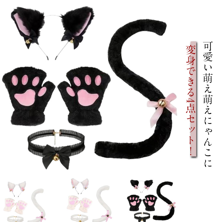 4点セット コスチューム用小物 猫耳カチューシャ 猫しっぽ 肉球手袋 首輪 ハロウィン コスプレ衣装 コスチューム イベント パーティー グッズ 可愛い