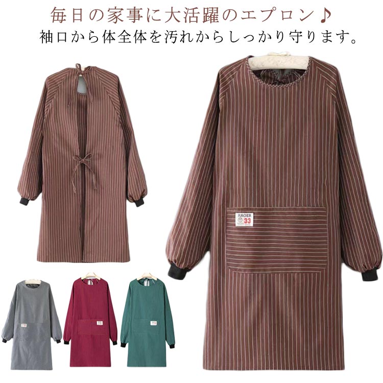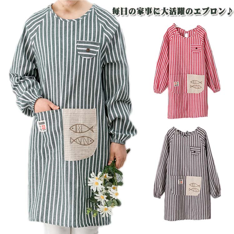 割烹着 かわいい おしゃれ 保育士 エプロン スモック 大人 かっぽう着 長袖 袖付き シンプル ストライプ ポケット 料理 キッチン ガーデニング ロング かっぽうぎ