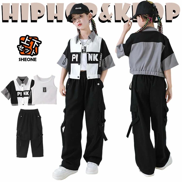 へそ出し 黒 ブラック 個性派 半袖 キッズ ダンス衣装 セットアップ 女の子 カーゴパンツ パンツ トップス カジュアル カジュアルシャツ ダンスウェア ヒップホップ ジャズダンス ポ
