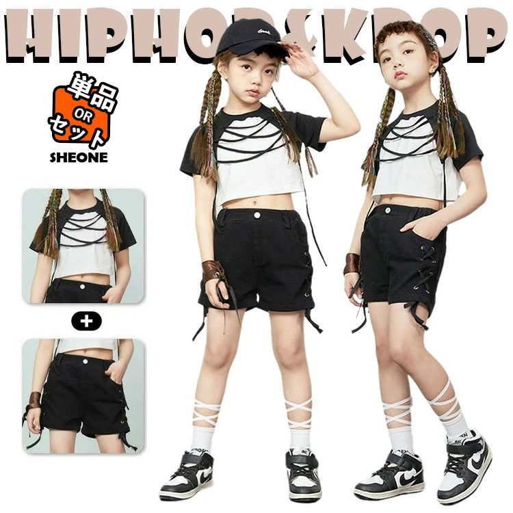 黒 ブラック へそ出し 半袖 キッズ ダンス衣装 セットアップ 女の子 ショートパンツ トップス チア チアガール 子供 ストリート ダンスウェア ヒップホップ ジャズダンス ポッピング