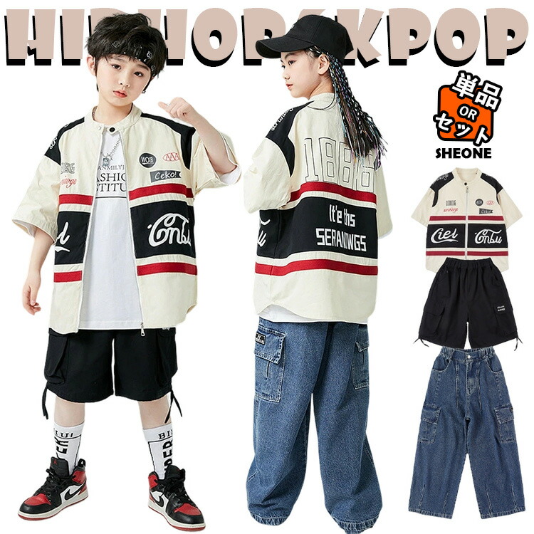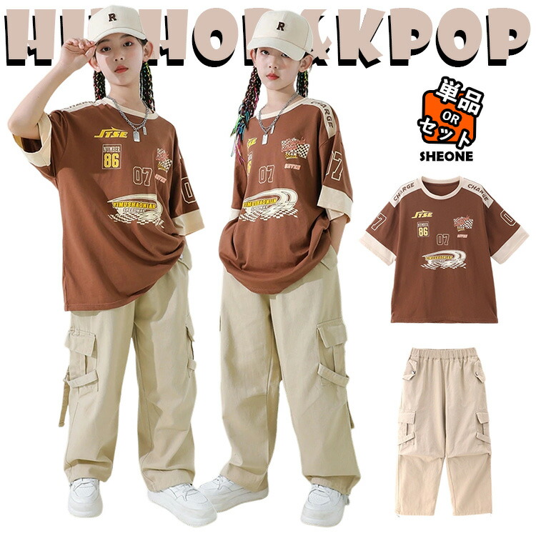 茶色 レーシング キッズ ダンス衣装 セットアップ 男の子 女の子 かっこいい おしゃれ 半袖 シャツ ゆったり カジュアルシャツ トップス 白 ベージュ ダンスパンツ サルエルパンツ カ