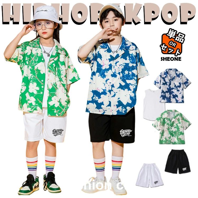 青 緑 柄シャツ 総柄シャツ 半袖 夏 キッズ ダンス衣装 セットアップ 男の子 女の子 パッチワーク アロハシャツ ショートパンツ トップス パンツ ダンスウェア ヒップホップ ジャズダ