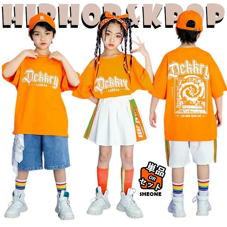 チア キッズ ダンス衣装 セットアップ 男の子 女の子 かっこいい チアガール かわいい オレンジ橙色 トップス オレンジ ホワイト 短パン スカート デニム短パン おしゃれ ファッショ
