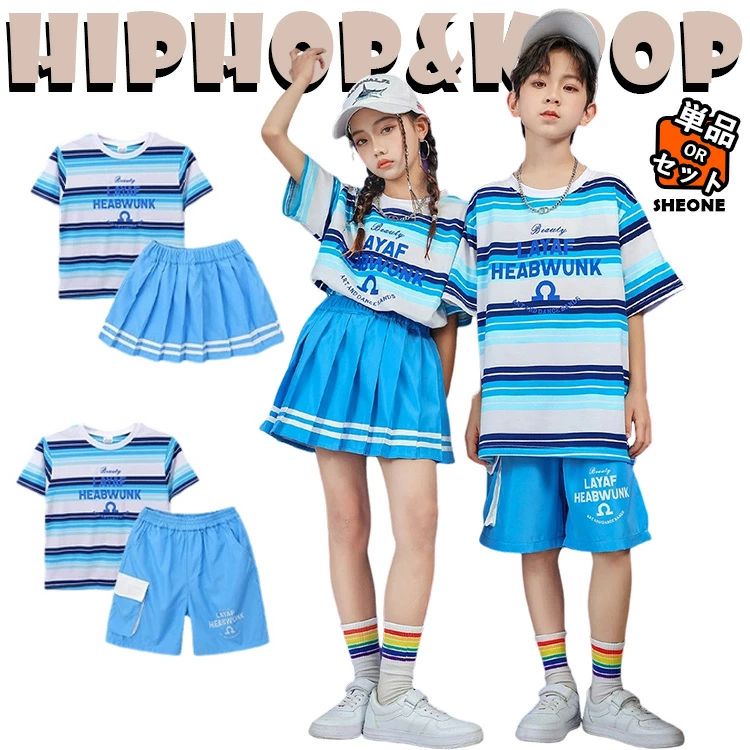 青 ブルー ボーダー 半袖 キッズ ダンス衣装 セットアップ 男の子 女の子 チア チアガールトップス スカート ショートパンツ ダンスウェア ヒップホップ ジャズダンス ポッピング 韓