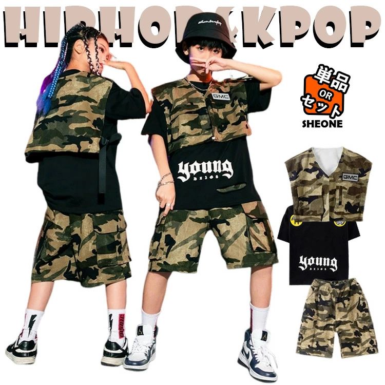 迷彩 ベスト 半袖 夏 キッズ ダンス衣装 セットアップ ショートパンツ トップス カジュアル パンツ カジュアル ダンスウェア ヒップホップ ジャズダンス ポッピング 演出服 練習着 団
