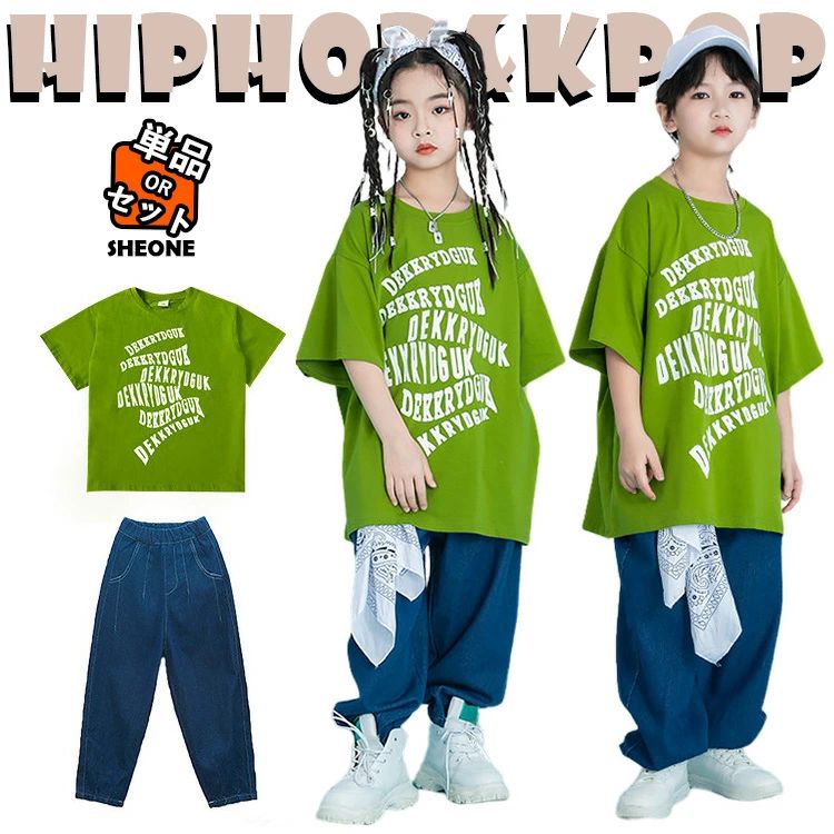 緑 おしゃれ ゆったり 半袖シャツ キッズ ダンス衣装 男の子 女の子 かっこいい グリーン ワンポイント カジュアルシャツ トップス デニムパンツ ヒップホップ ジャズダンス 韓国k-po
