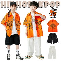 オレンジ カーゴパンツ 半袖 キッズ ダンス衣装 セットアップ 男の子 女の子 トップス ショートパンツ カジュアルシャツ ダンスウェア ヒップホップ ジャズダンス ポッピング 演出服