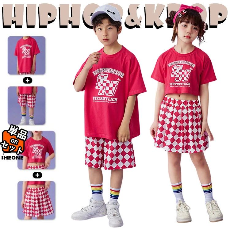 赤色 ブロックチェック キッズ ダンス 衣装 発表会 サルエルパンツ ヒップホップ 韓国 ダンス衣装 セットアップ 半袖tシャツ トップス チア ホワイト パンツ ミニスカート ゆったり