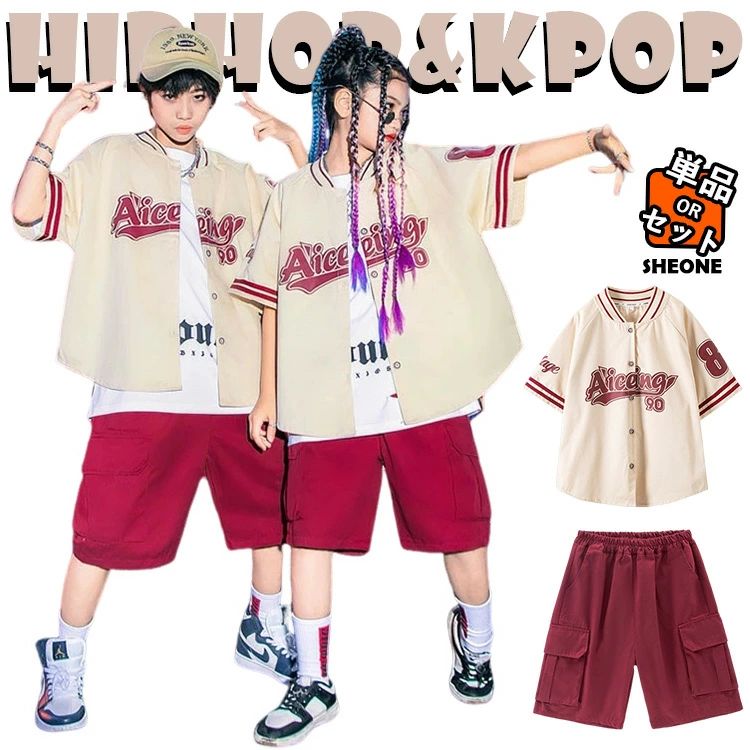 赤 ベースボールシャツ 夏 半袖 キッズ ダンス衣装 セットアップ 男の子 女の子 かっこいい おしゃれ ゆったり カジュアルシャツ トップス レッド カーゴ短パン ジャズダンス ヒップ