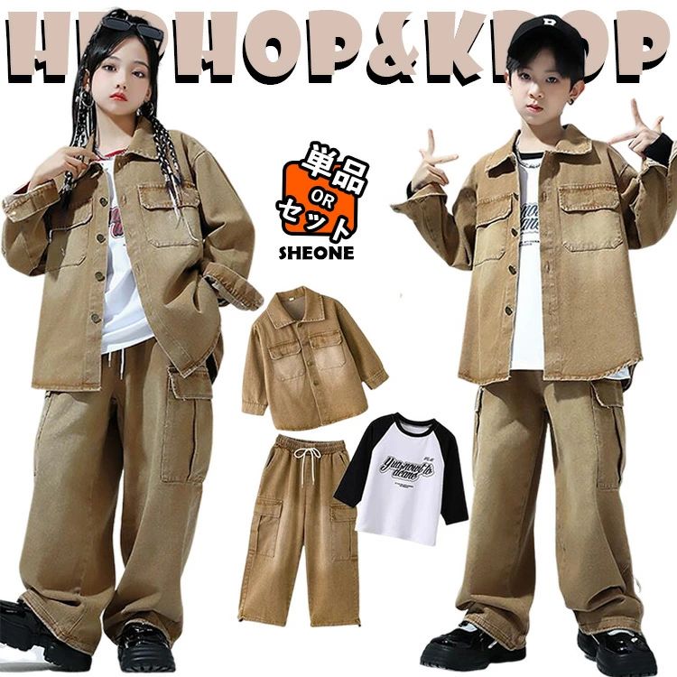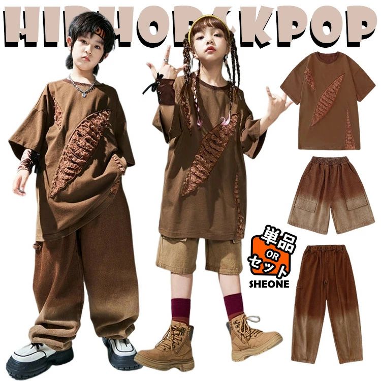 キッズ ダンス衣装 セットアップ ブラウン 茶色 デニム 半袖シャツ 女の子 男の子 かっこいい ゆったり トップス 迷彩 短パン サルエルパンツ ジャズダンス ヒップホップ 韓国k-pop