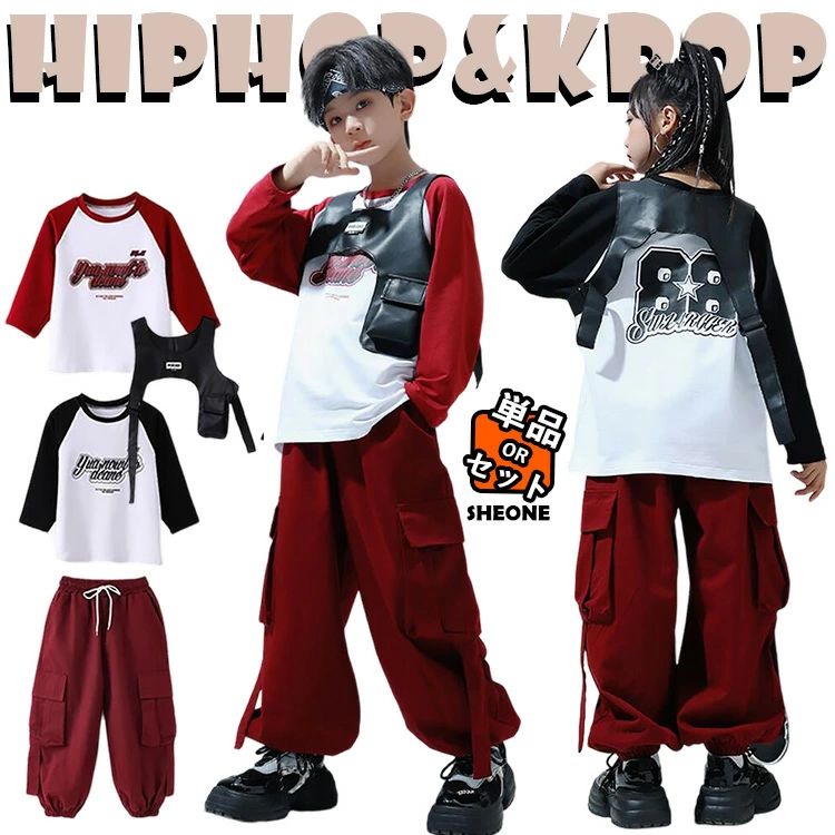 黒色 レッド キッズ ダンス衣装 セットアップ シャツ ベスト トップス 柄トップス パンツ ゆったり 男の子 女の子 かっこいい 長袖 カジュアル トップス ロングパンツ ダボパン カー
