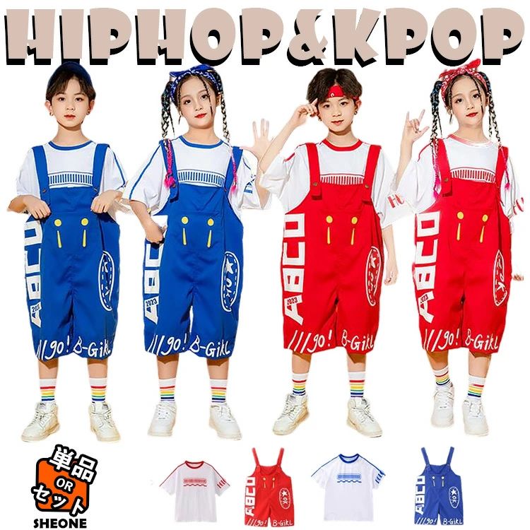 ブルー レッド 長袖 夏 キッズ ダンス衣装 オーバーオール パンツ トップス ソックス パフォーマンス セットアップ 女の子 男の子 おしゃれ ゆったり カジュアルシャツ スポーツ tシ