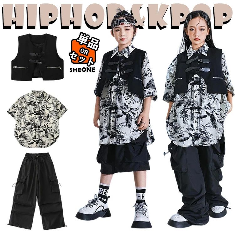 和風 暗闇系 キッズ ダンス衣装 セットアップ 黒 ブラック かっこいい 半袖シャツ Tシャツ カーゴパンツ ワイドパンツ ベスト ダンスパンツ ジャズダンス ヒップホップ 韓国- 演