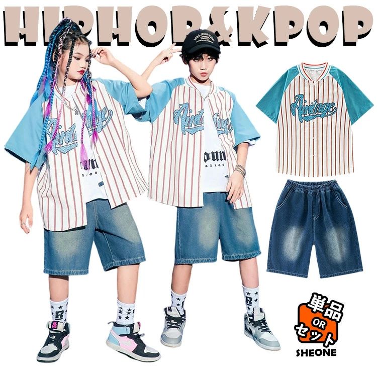 ストライプ 青 ブルー ベースボールシャツ デニム 半袖 キッズ ダンス衣装 男の子 女の子 トップス パンツ セットアップ かっこいい ダンスウェア ヒップホップ ジャズダンス ポッピ