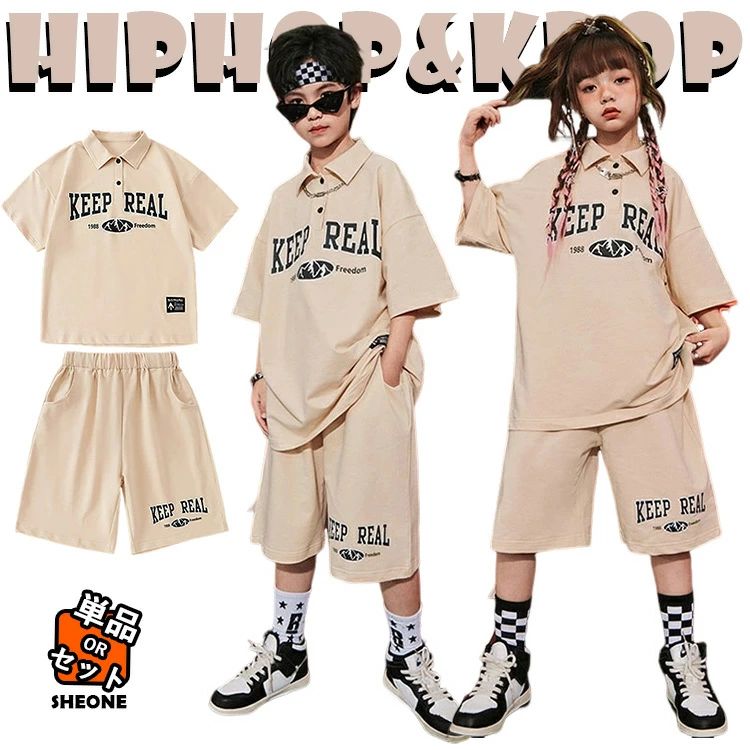 ベージュ キッズ ダンス衣装 セットアップ 男の子 女の子 セットアップ かっこいい かわいい ポロシャツ ショートパンツ ジャズダンス ヒップホップ 韓国- 演出服 団体服 応援団