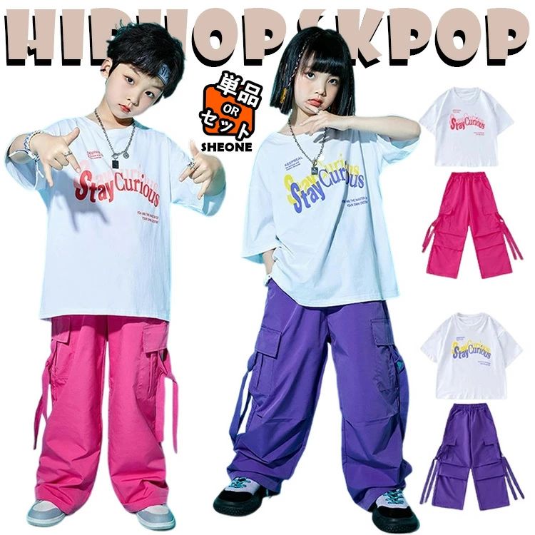 パープル 紫 ピンク 桃色 キッズ ダンス衣装 セットアップ 男の子 女の子 かっこいい かわいい カーゴパンツ パープル 紫 ピンク 桃色 Tシャツ ジャズダンス ヒップホップ 韓国-