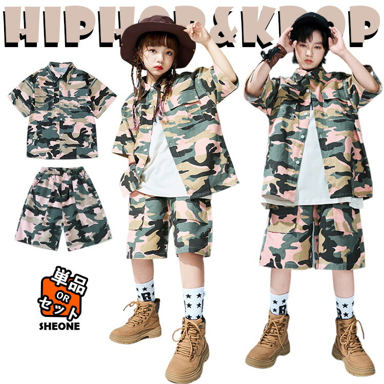 迷彩 柄シャツ 2点セット 3点セット キッズ ダンス衣装 セットアップ 白タンクトップ 半袖シャツ 男の子 女の子 トップス 迷彩 短パン ヒッフポッフ ジャズダンス 韓国 kpop 発表会