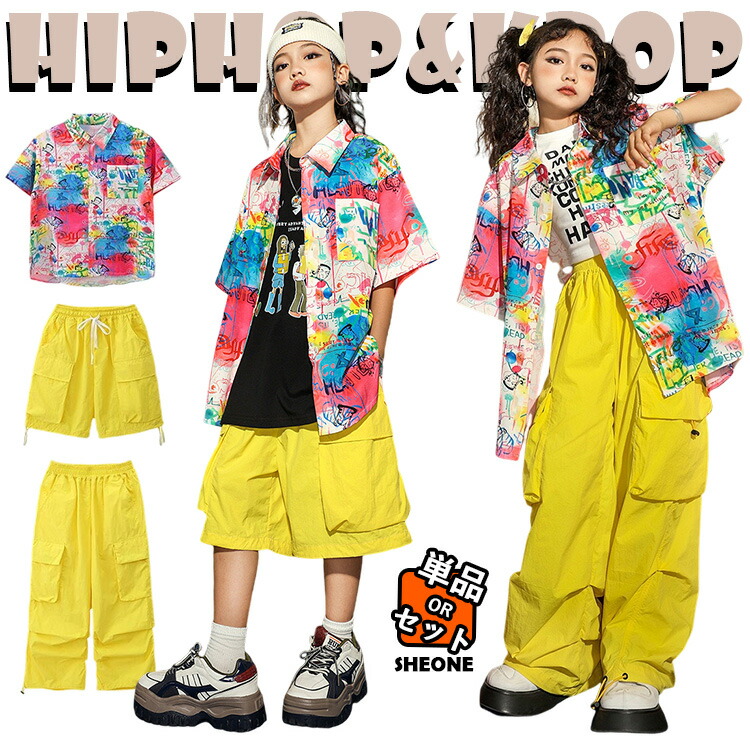 柄シャツ 総柄 黄色 虹色 キッズ ダンス衣装 セットアップ ベスト 半袖シャツ 男の子 女の子 へそ出し トップス 短パン ロンパン サルエルパンツ ヒッフポッフ ジャズダンス 韓国
