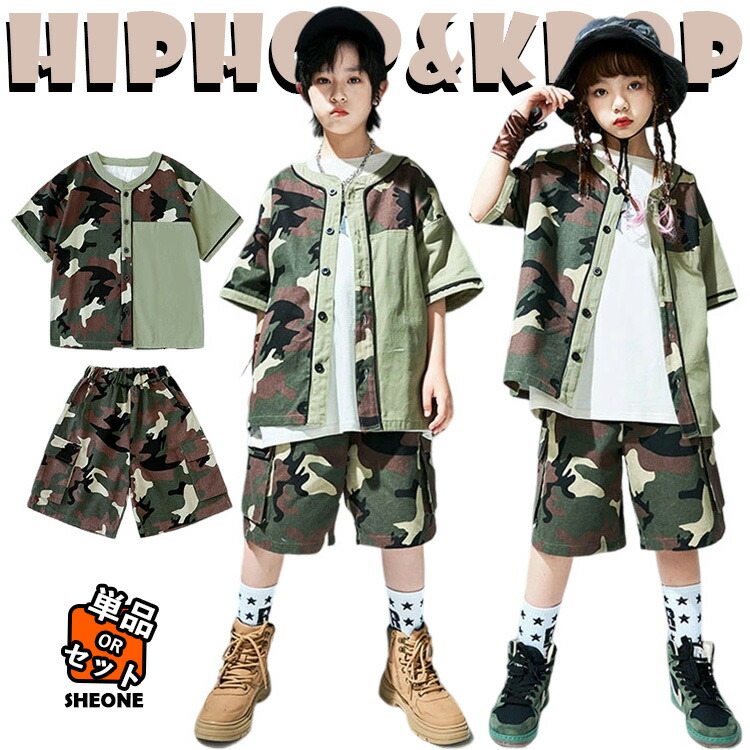 迷彩 柄シャツ 2点セット 3点セット キッズ ダンス衣装 セットアップ 白タンクトップ 半袖シャツ 男の子 女の子 トップス 迷彩 短パン ヒッフポッフ ジャズダンス 韓国 発表会