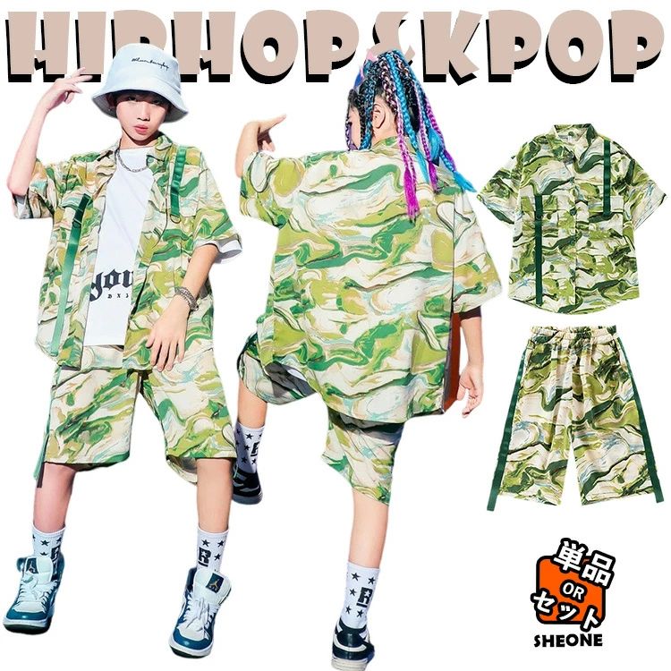 緑 グリーン 総柄 総柄シャツ タイダイ 半袖 夏 キッズ ダンス衣装 男の子 女の子 トップス ショートパンツ セットアップ かっこいい ダンスウェア ヒップホップ ジャズダンス ポッピ
