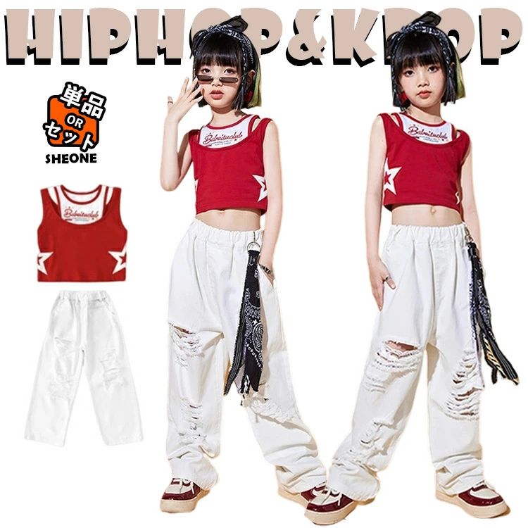 チアガール へそ出し レッド 赤 ホワイト 白 キッズ ダンス衣装 セットアップ 女の子 セットアップ かっこいい かわいい カーゴパンツ ダメージ加工 ホワイト 白 タンクトップ レッド