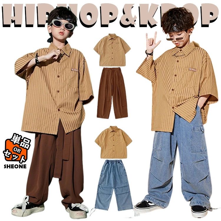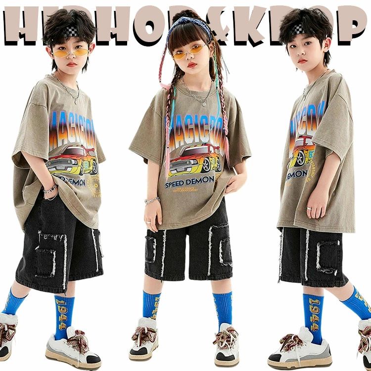 茶色 ブラウン キッズ ダンス衣装 セットアップ 派手 かっこいい 2点セット 半袖シャツ カジュアルパンツ デニムパンツ ヒップホップ 子供服 ジャズダンス ステージ衣装 団体
