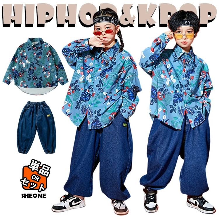 柄シャツ 総柄 デニム キッズ ダンス衣装 女の子 男の子 個性派 かっこいい セットアップ トップス パンツ カジュアルシャツ ダンス ダンスウェア 上下セット ヒップホップ ジャズダ