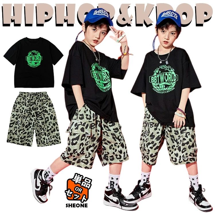ヒョウ柄 キッズ ダンス衣装 セットアップ 豹柄 派手 かっこいい 2点セット Tシャツ 黒 ショートパンツ ヒョウ柄 ヒップホップ HIPHOP 子供服 ジャズダンス ステージ衣装 団体服 原宿