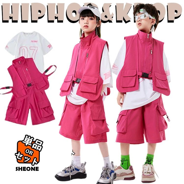 桃色 ピンク ショートパンツ ベスト キッズ ダンス衣装 セットアップ 男の子 女の子 ショートカーゴパンツ ダンス服 Tシャツ ベスト ヒップホップ 上下セットアップ パンツ