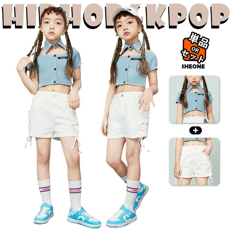 へそ出し 白 青 半袖 キッズ ダンス衣装 セットアップ 女の子 チア チアガール ショートパンツ トップス 子供 ダンスウェア ヒップホップ ジャズダンス ポッピング 演出服 練習着 団