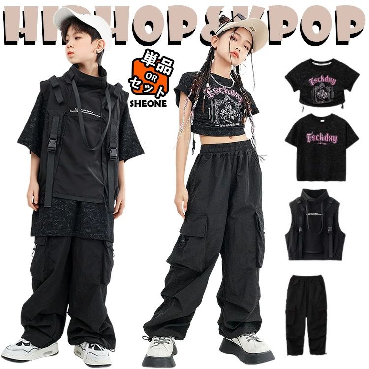 ベスト カーゴパンツ へそ出し 半袖 夏 キッズ ダンス衣装 セットアップ 男の子 女の子 トップス カジュアル パンツ ダンスウェア ヒップホップ ジャズダンス ポッピング ブラック 演