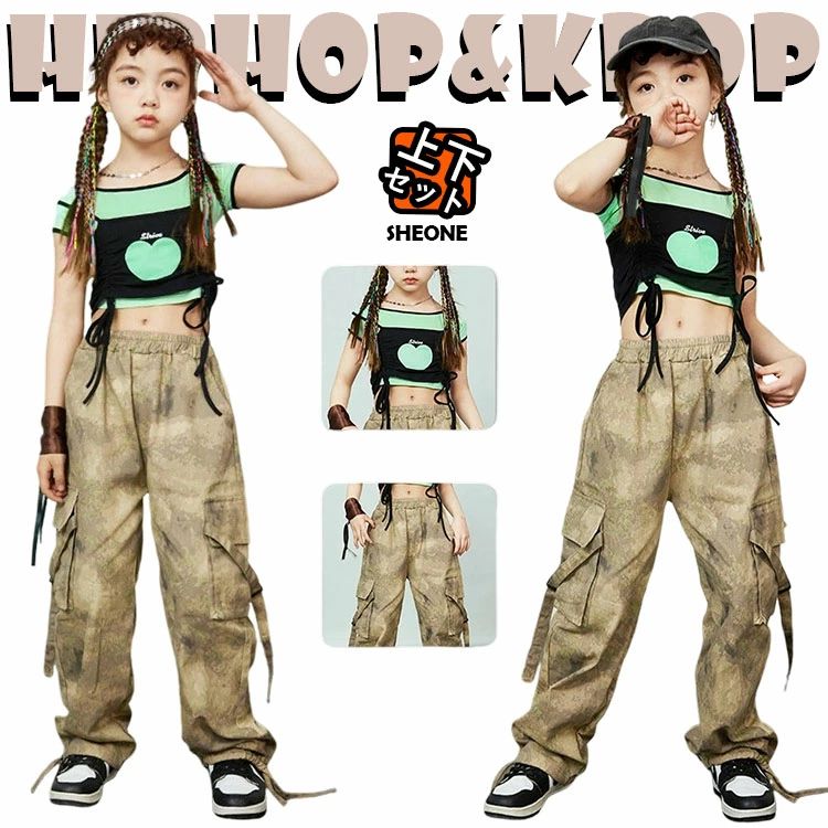 へそ出し 迷彩 半袖 夏 キッズ ダンス衣装 セットアップ 緑 女の子 トップス パンツ ロングパンツ カジュアル 子供 ストリート ダンスウェア ヒップホップ ジャズダンス ポッピング