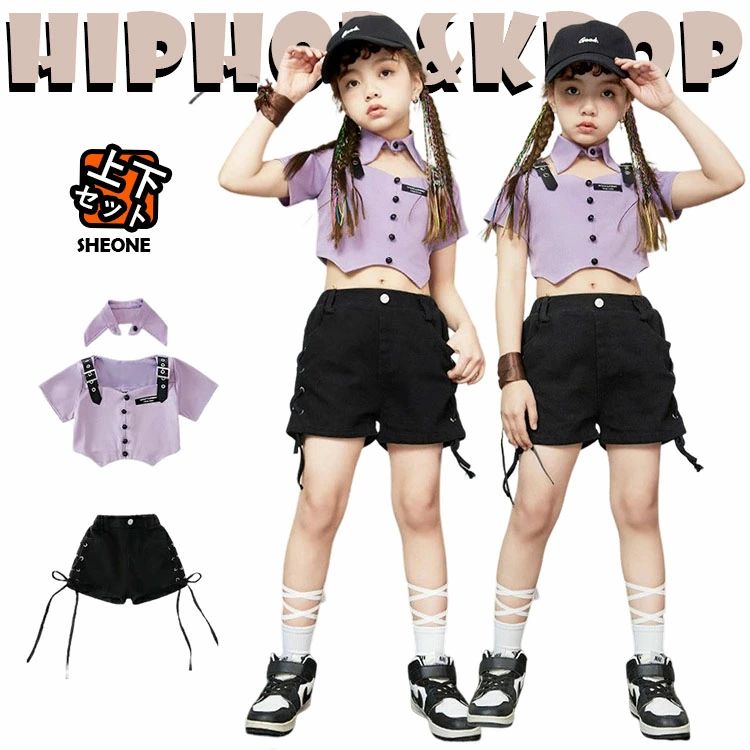 黒 紫 パープル へそ出し 半袖 キッズ ダンス衣装 セットアップ ショートパンツ トップス チア チアガール 子供 派手 ストリート ダンスウェア ヒップホップ ジャズダンス ポッピング