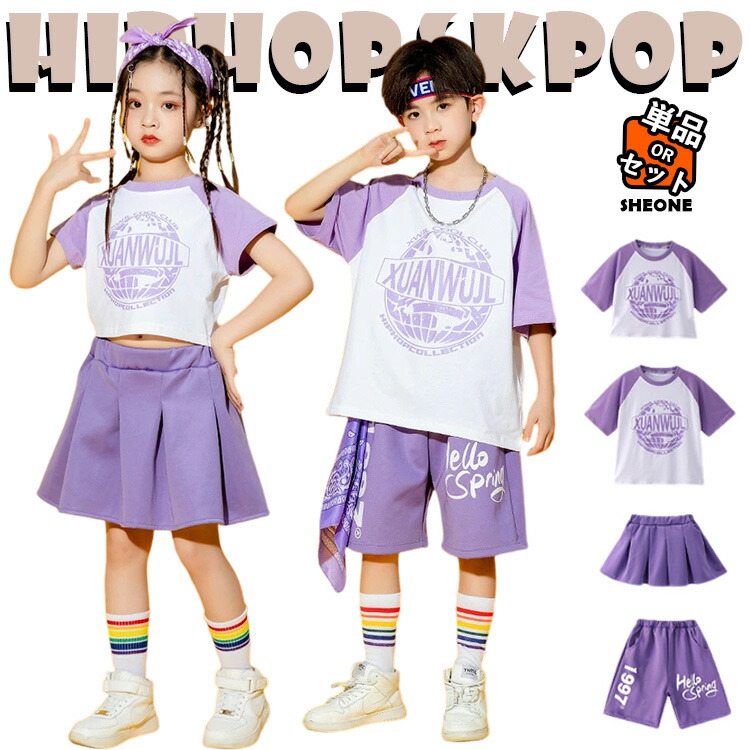チア チアガールズ 紫 キッズ ダンス衣装 セットアップ 男の子 女の子 子供 カジュアル トップス スカート ショートパンツ ダンスウェア ヒップホップ ジャズダンス 韓国 演出服 練習