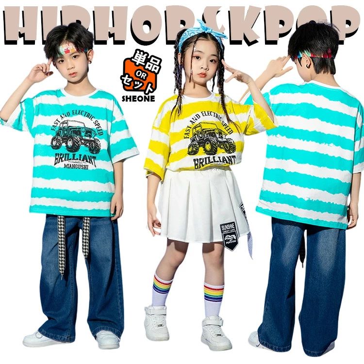 水色 青色 黄色 ストライプ 柄 キッズ ダンス衣装 セットアップ 男の子 女の子 かっこいい ゆったり カジュアルシャツ トップス ホワイト スカート デニムパンツ ダンス衣装 ヒップホ