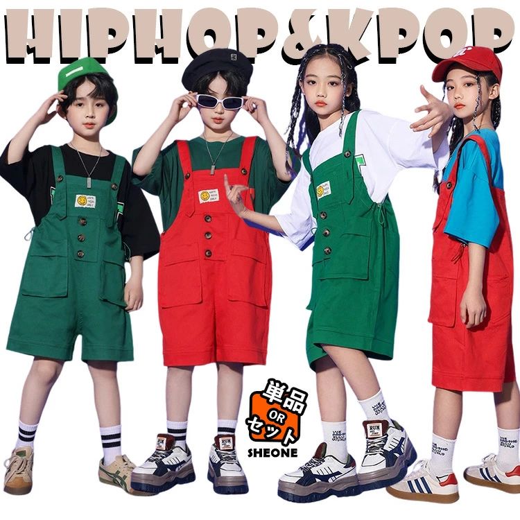 白 緑 黒 オーバーオール 半袖 キッズ ダンス衣装 セットアップ 男の子 女の子 チア チアガール トップス パンツ ダンスウェア ヒップホップ ジャズダンス ポッピング 韓国 演出服 練