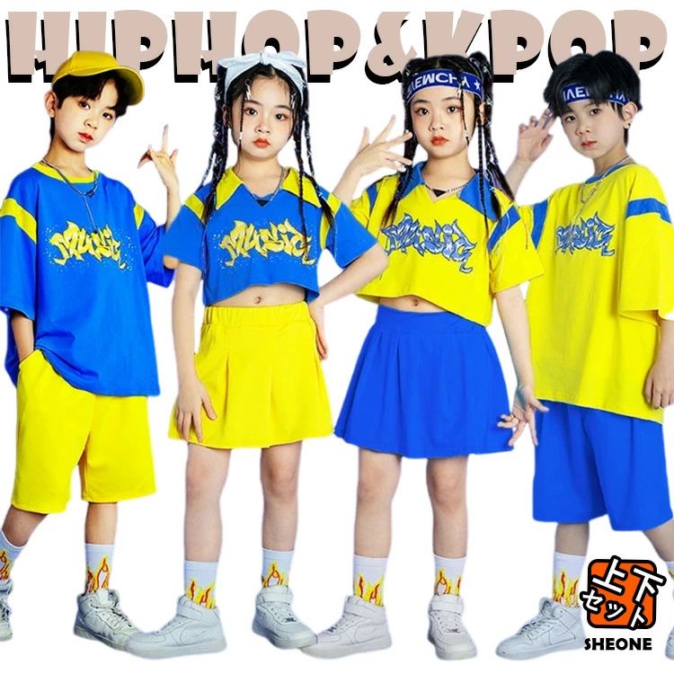 黄色 青色 キッズ ダンス衣装 セットアップ 男の子 女の子 かっこいい ゆったり カジュアルシャツ 半袖シャツ トップス ハーフパンツ 短パン ヒップホップ ジャズダンス 韓国-
