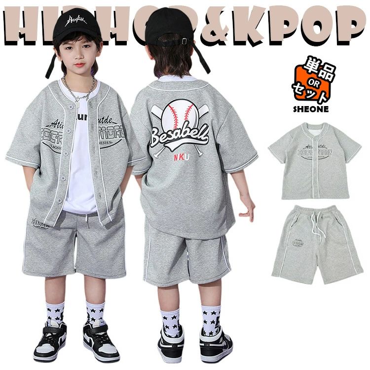 グレー ベースボールシャツ 半袖 夏 キッズ ダンス衣装 セットアップ 男の子 女の子 トップス ショートパンツ カジュアル ダンスウェア ヒップホップ ジャズダンス ポッピング 演出服