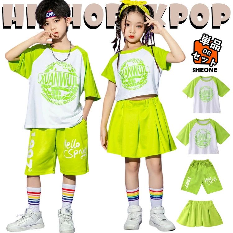 蛍光緑 へそ出し 半袖 緑 グリーン キッズ ダンス衣装 セットアップ 男の子 女の子 チア チアガール ショートパンツ トップス スカート ヒップホップ ジャズダンス ポッピング 韓国