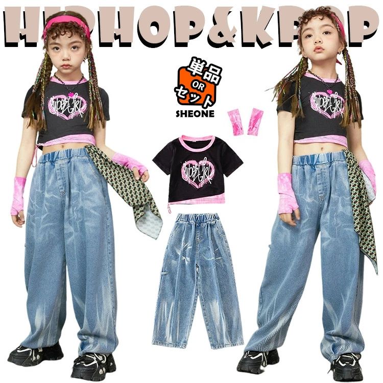 黒 へそ出し デニム 半袖 キッズ ダンス衣装 セットアップ トップス パンツ チア チアガール 子供 派手 ストリート ダンスウェア ヒップホップ ジャズダンス ポッピング 演出服 練習