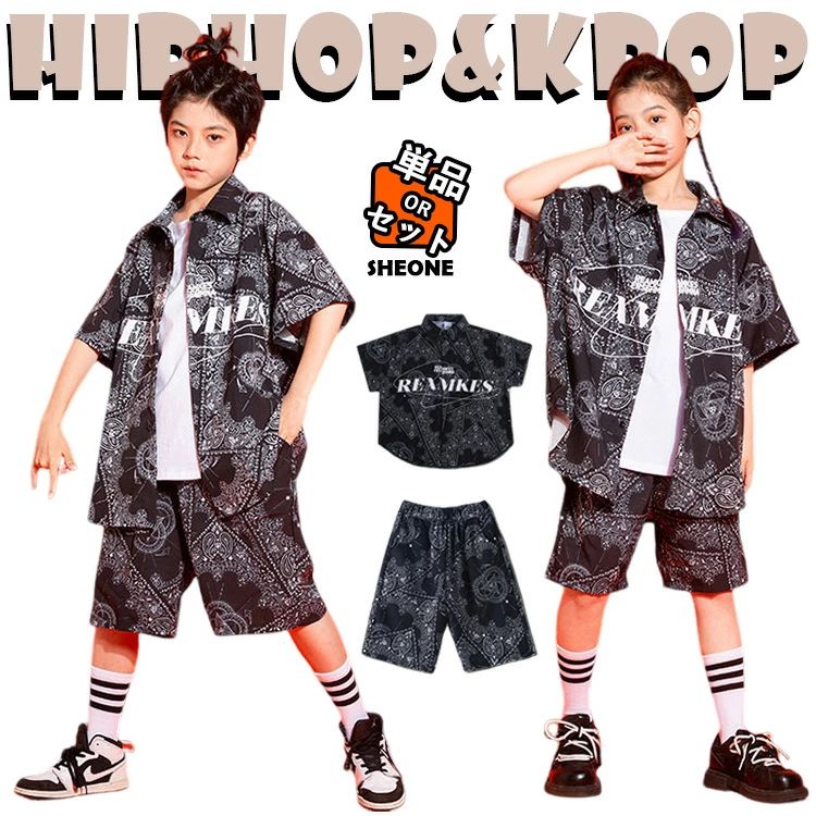 黒ペイズリー柄 キッズ ダンス衣装 セットアップ 男の子 女の子 かっこいい おしゃれ 半袖 シャツ ゆったり カジュアルシャツ トップス 白 ショート丈パンツ 黒 短パン ジャズダンス