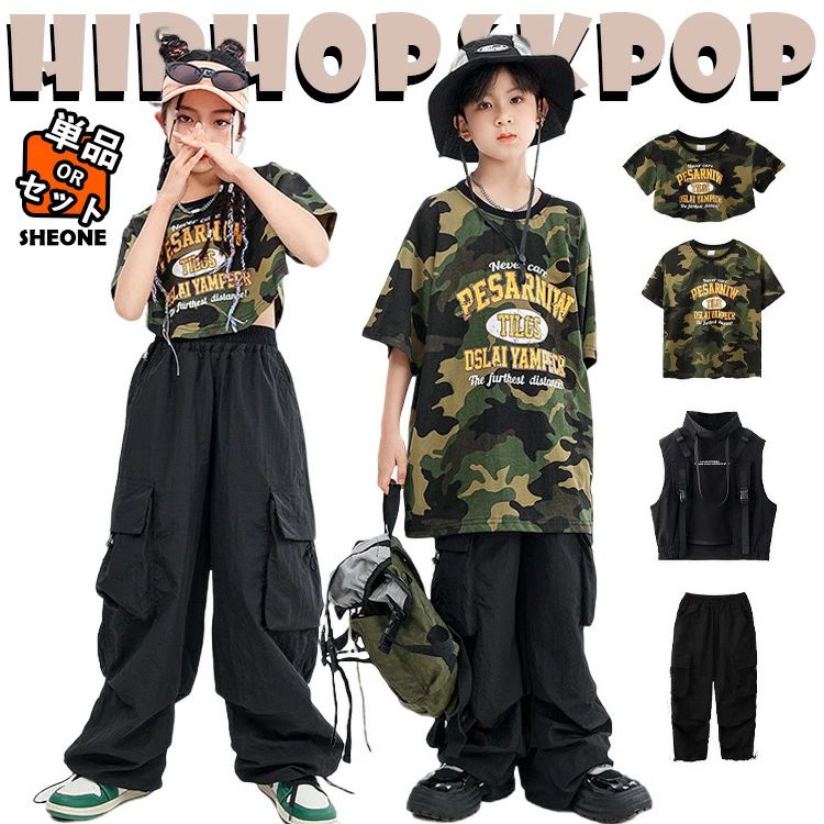 へそ出し 迷彩 ベスト カーゴパンツ キッズ ダンス衣装 セットアップ 男の子 女の子 トップス カジュアル パンツ カジュアル ダンスウェア ヒップホップ ジャズダンス ポッピング 韓