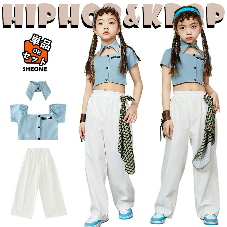へそ出し 青 白 キッズ ダンス衣装 セットアップ 女の子 チア チアガール パンツ トップス カジュアル 子供 派手 ストリート ダンスウェア ヒップホップ ジャズダンス ポッピング 韓