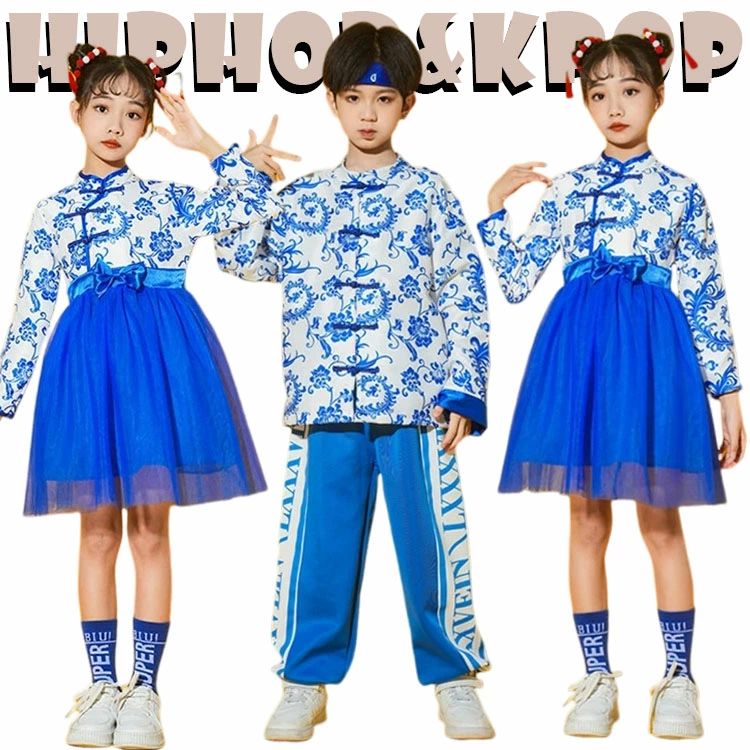 青 花柄 キッズ ダンス 衣装 中国風 おしゃれ かっこいい かわいい 女の子 男の子 セットアップ ゆったり トップス パンツ ワンピース ソックス ジャズダンス ヒップホップ 派手 韓国