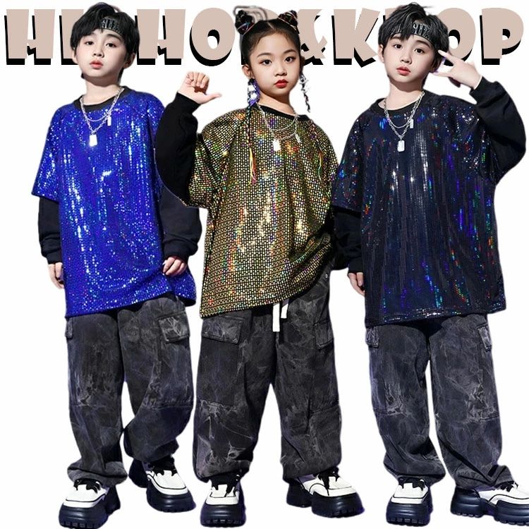 スパンコール キラキラ 全3色 キッズ ダンス 衣装 おしゃれ かっこいい かわいい 女の子 男の子 セットアップ ゆったり トップス パンツ ジャズダンス ヒップホップ 派手 韓国 kpop