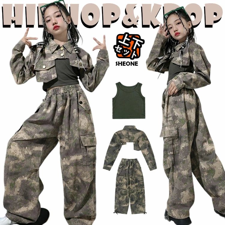 迷彩 キッズ ダンス衣装 セットアップ 女の子 へそ出し へそ出しトップス ワイドパンツ タンクトップ 派手 ヒップホップ かっこいい 子供服 ジャズダンス ステージ衣装 団体服