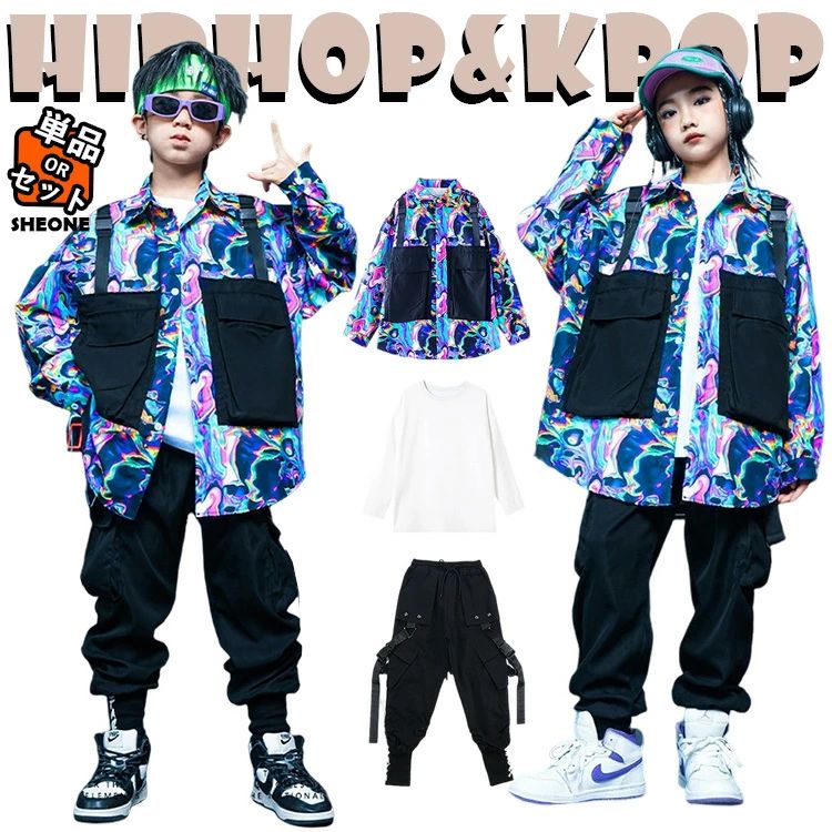 黒 キッズ ダンス 衣装 セットアップ おしゃれ かっこいい ゆったり かわいい 長袖 女の子 男の子 トップス カーゴパンツ シャツ ジャズダンス ヒップホップ 派手 ファッション 韓国