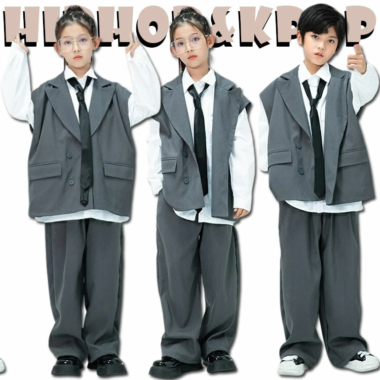 ベスト カジュアルパンツ シャツ 灰色 キッズ ダンス衣装 セットアップ 女の子 男の子 派手 かっこいい ヒップホップ 子供服 ジャズダンス ロックダンス ステージ衣装 団体