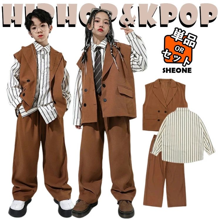 ベスト カジュアルパンツ シャツ 茶色 キッズ ダンス衣装 セットアップ 女の子 男の子 派手 かっこいい ヒップホップ 子供服 ジャズダンス ロックダンス ステージ衣装 団体服