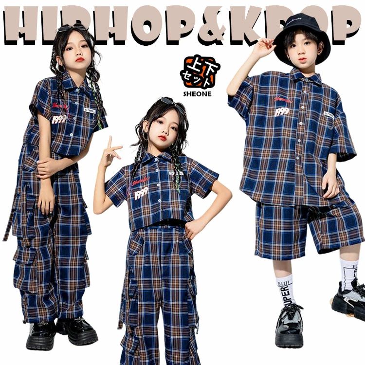 ネイビー チェック キッズ ダンス衣装 セットアップ チェックセット 女の子 男の子 パンツ トップス 半袖 シャツ カジュアル 子供 ストリート ダンスウェア ヒップホップ ジャズダン